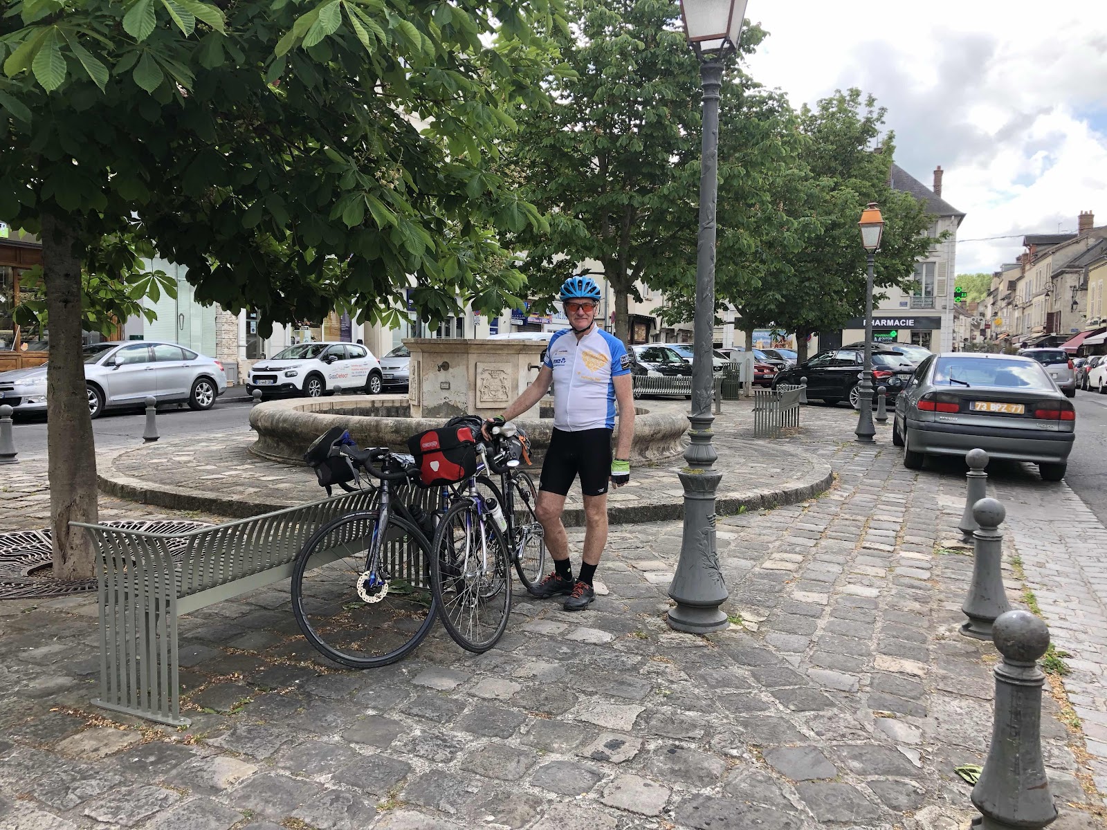 Morning tea was at Fleury en Bier a very quaint town with a large chateau. Chris had a sandwich ( baguette) and I had coffee and a cake. Then it was on to Nemours for lunch but not before trying to find a bike shop.... I wanted to get my tyre pressure checked and Chris wanted a new pair of bike gloves.... well the bike shop turned out to be more of a garden implement shop with ride on movers, chain saws etc than bike gear. The owner was very helpful and managed to get my tyres pumped up but as for bike gloves!!!